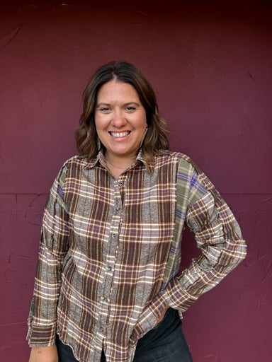 This button-up takes cozy flannel vibes and adds a little unexpected contrast for that effortlessly cool, lived-in look. With its mix of earthy pla...