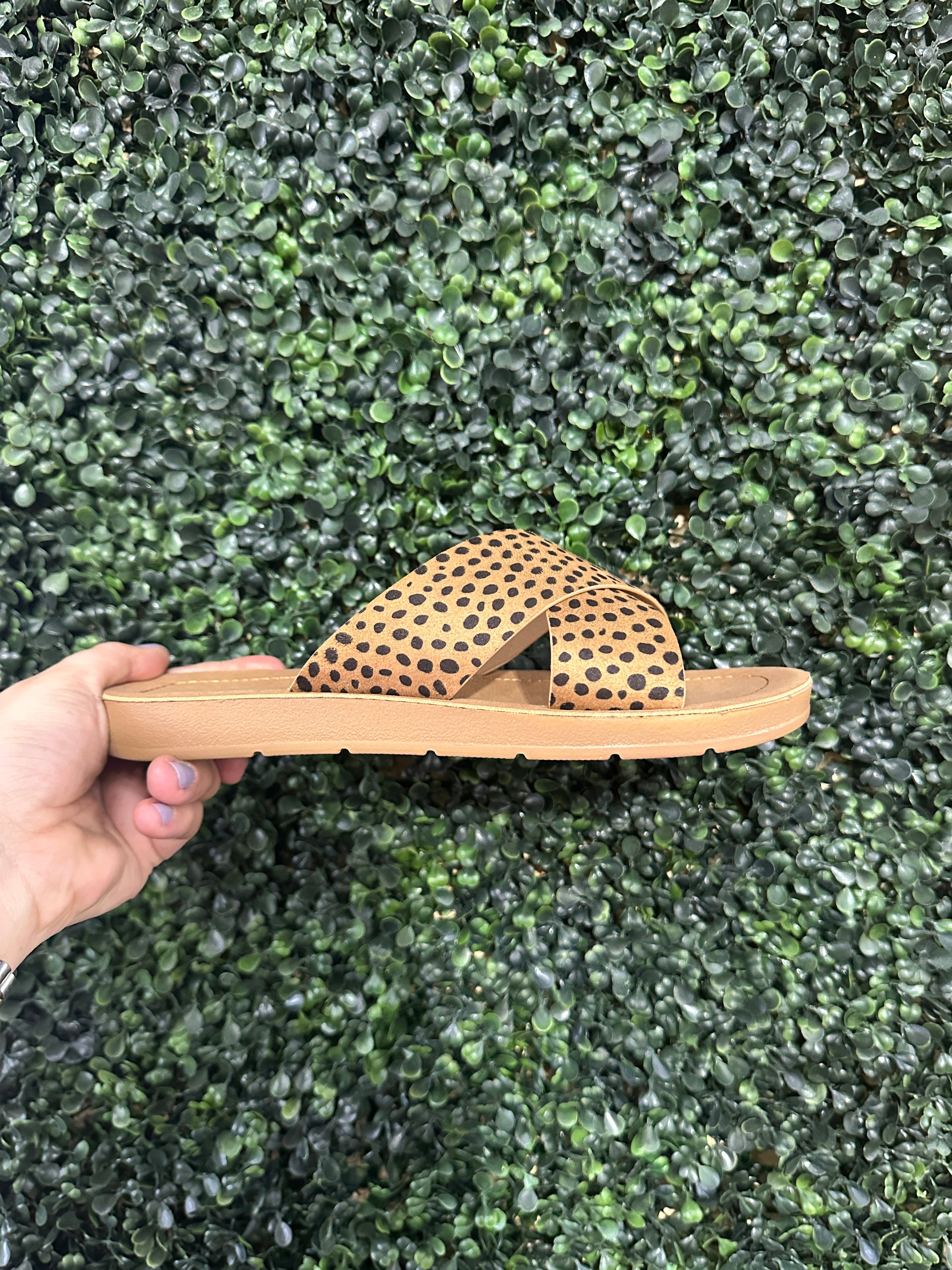 Slip into wild style with our Crisscross Leopard Slides. These slip-on sandals feature a crisscross band strap and flip flop sliders, perfect for any casual outing. Take a walk on the wild side with these trendy and comfortable slides.