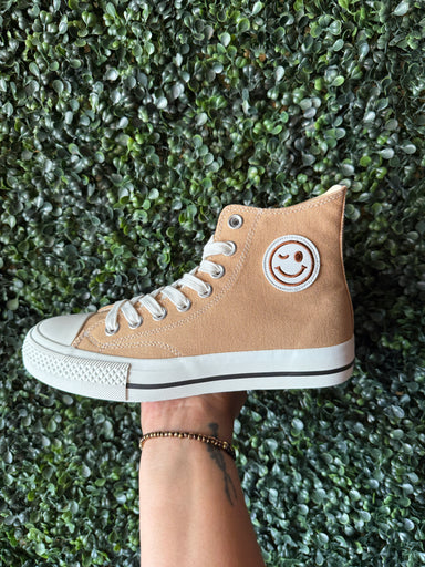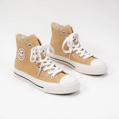 A classic high-top with a little extra personality. These tan canvas sneakers are all about easy-going vibes, with a cheeky embroidered smiley face...