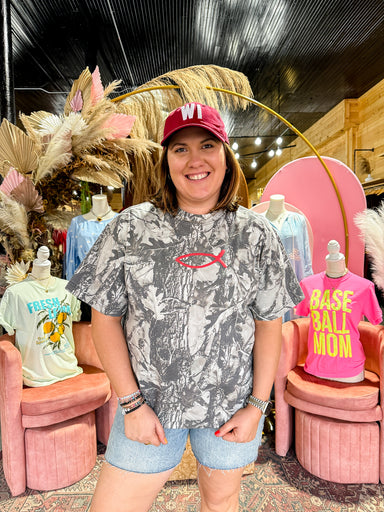 Subtle, but not really. The kind of graphic you notice twice. Women’s camo graphic tee featuring a small fish symbol detail for a minimal, faith-in...