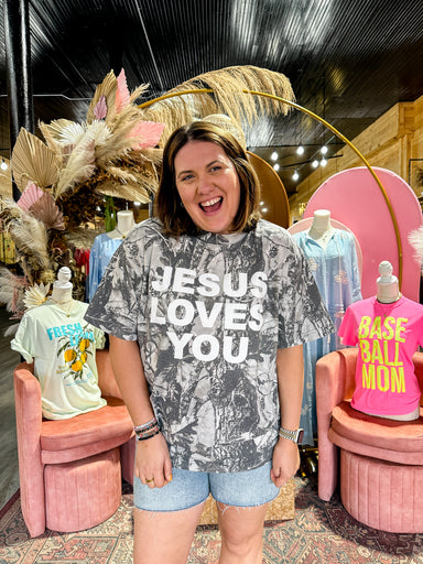 Bold, simple, and says it all. The graphic that starts conversations without you having to. Women’s camo graphic tee featuring a bold “Jesus Loves ...