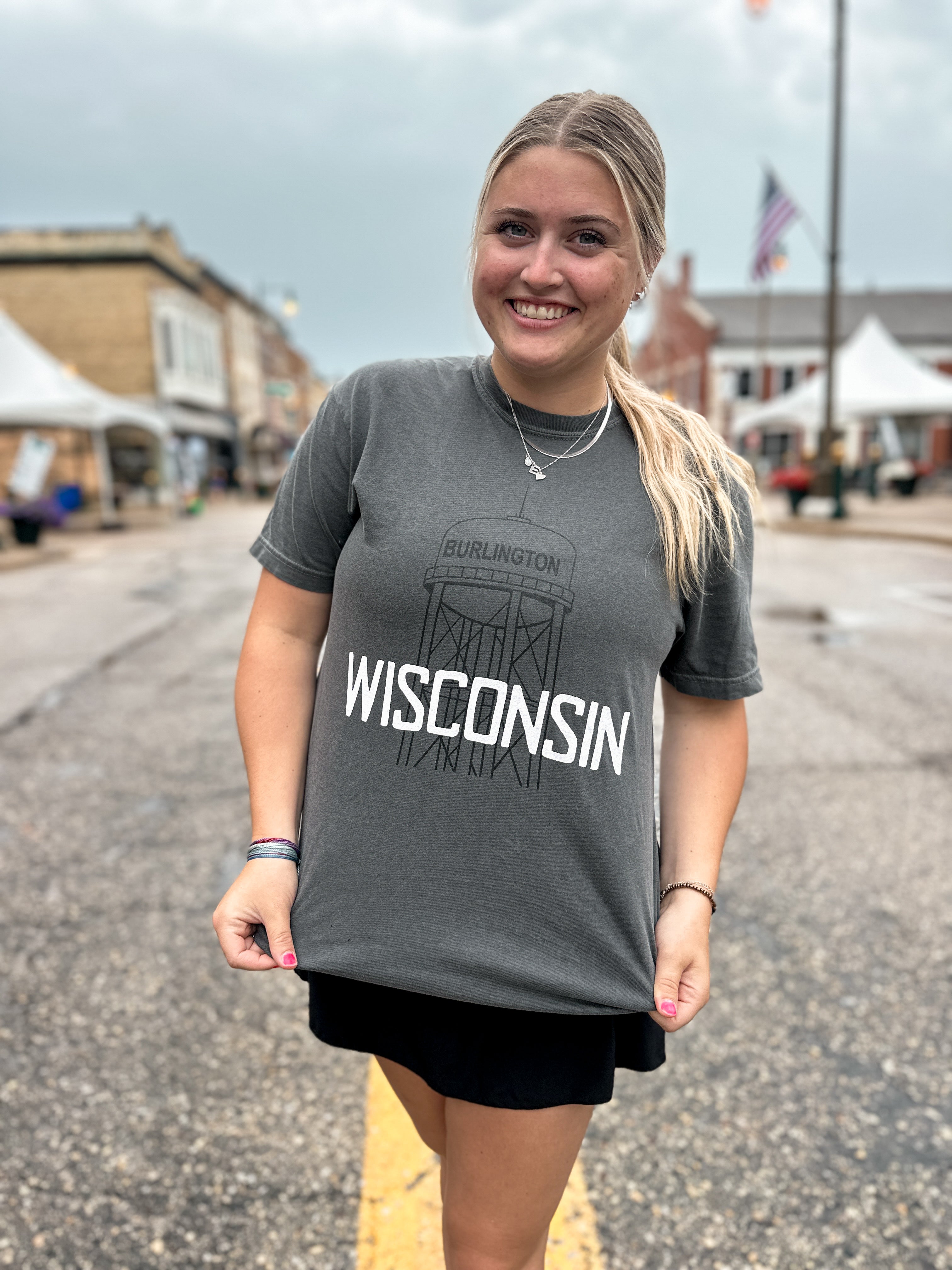 Garment-dyed pepper grey with black Burlington water tower + “Wisconsin” graphic